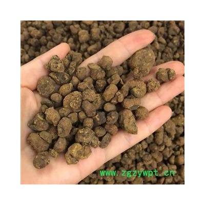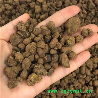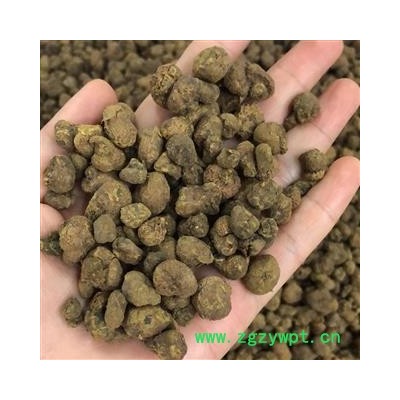性状:呈不规则的扁球形,表面棕色或灰黄色,多皱缩。质硬而脆,断面黄褐色,角质样,有蜡样光泽,味苦、微辛,大小不等。