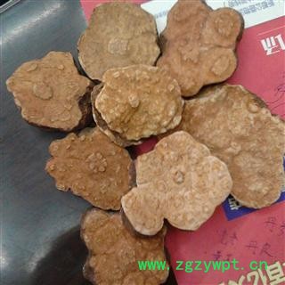 性状:本品呈团块状或不规则纺锤形,长6~15cm,直径4~12cm。表面红棕色或红褐色,皱缩不平,有浅沟,并有横长皮孔样突起和细根痕。体重,质坚实,不易折断,断面浅黄棕色或浅红棕色,显粉性,皮部有4~11个类圆形异型维管束环列,形成云锦状花纹,中央木部较大,有的呈木心。气微,味微苦而甘涩。