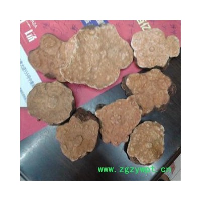 性状:本品呈团块状或不规则纺锤形,长6~15cm,直径4~12cm。表面红棕色或红褐色,皱缩不平,有浅沟,并有横长皮孔样突起和细根痕。体重,质坚实,不易折断,断面浅黄棕色或浅红棕色,显粉性,皮部有4~11个类圆形异型维管束环列,形成云锦状花纹,中央木部较大,有的呈木心。气微,味微苦而甘涩。