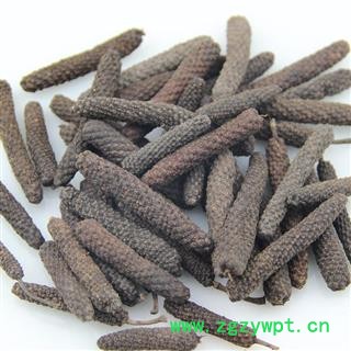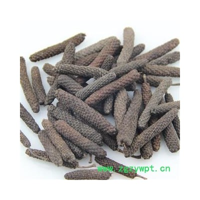 【药材性状】:圆柱形,稍弯曲,由多数小浆果集合而成,长1.5~3.5cm,直径0.3~0.5cm。表面黑褐色或棕色,有斜向排列整齐的小突起,基部有果穗梗残存或脱落。质硬而脆,易折断,断面不整齐,颗粒状。小浆果球形,有特异香气,味辛辣。