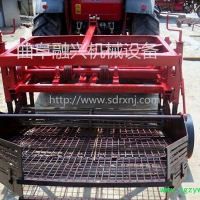 曲阜融兴药材收获机在于克服现有技术中的缺陷,提供一种结构简单、方便实用,省时省力和工作效率高的根茎类药材收获机,工作原理:经悬挂架将本机固定在大型**拖拉机后悬挂上,变速箱经动力输入轴与拖拉机上的输出轴相连接,开动机器,松土铲插入土壤中(如果深度不够,可以把拖拉机后边所带的上拉杆调短),将药材的根茎从土壤中铲出,根茎连同土块进入振动筛上,对包裹药材根茎的土块进行振动操作,振动掉一部分土块,振动后的土块和药材根茎进入前传输带上,再漏掉一部分土块,在前传输带运输的过程中,机子自带的碎土压辊可将大土块碾压成小土块,经过碾压处理后的土块和药材根茎进入后传输带上,压碎的土块经后传输带漏掉,后传输带将药材根茎送入回收箱内,完成药材的收割回收,网状式输送带可对药材根茎进行98%以上的回收,大大提高了工作效率。
