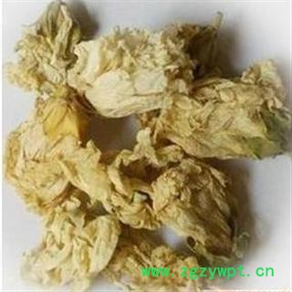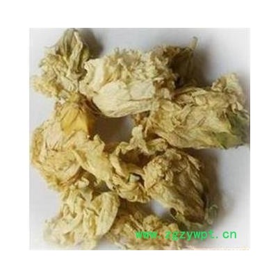 性状规格:干燥花卷缩呈卵形或圆柱形团状,长约3厘米,直径约1.5厘米。底部有灰绿色或黄绿色的花萼,表面密生细小绒毛,边缘 5裂。花萼外面有数条灰绿色的线形苞片。常有短花柄。花瓣白色或黄白色,皱缩卷折。中间有黄色花蕊,系多数雄蕊联合成圆筒状,包围雌蕊。质轻,微香,味甘。