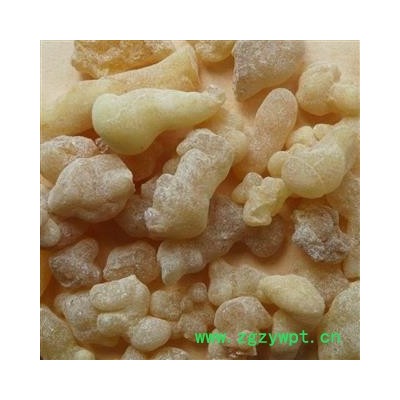 【性状颜色】:干燥胶树脂,多呈小形乳头状、泪滴状颗粒或不规则的小块,长0.5~3厘米,有时粘连成团块。淡黄色,常带轻微的绿色、蓝色或棕红色。半透明。表面有一层类白色粉尘,除去粉尘后,表面仍无光泽。质坚脆,断面蜡样,无光泽,亦有少数呈玻璃样光泽。气微芳香,味微苦。嚼之,初破碎成小块,迅即软化成胶块,粘附牙齿,唾液成为乳状,并微有香辣感。遇热则变软,烧之微有香气(但不应有松香气),冒黑烟,并遗留黑色残渣。与少量水共研,能形成白色乳状液。以淡黄色、颗粒状、半透明、无砂石树皮杂质、粉末粘手、气芳香者为佳。特质:无色或淡黄色,有树脂的香气 。