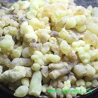 【性 状】长卵形滴乳状、类圆形颗粒或粘合成大小不等的不规则块状物。大者长达2cm(乳香珠)或5cm(原乳香)。表面黄白色,半透明,被有黄白色粉末,久存则颜色加深。质脆,遇热软化。破碎面有玻璃样或蜡样光泽。具特异香气,味微苦