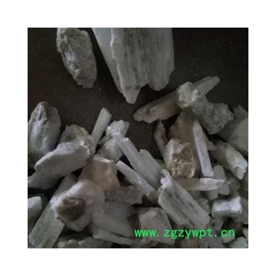 性状:本品为长柱状、针状或纤维状集合体,呈不规则块状、扁长条状或短柱状。大小不一。白色、浅灰白色或淡绿白色,具丝样光泽。体较重,质较重,质较硬脆,有的略疏松。可折断,碎断面不整齐,纵面呈纤维状或细柱状。气无,味淡。
