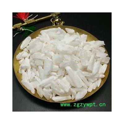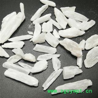 【颜色性状】:为长块状或不规则形纤维状的结晶集合体,大小不一。全体白色,无光泽及纹理。体重质松,易分成小块,纵断面具纤维状纹理,并有绢丝样光泽