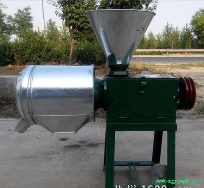 本机结构主要有由进料口、锥形磨和分离系统组成,磨面机的内、外磨头下端的配合面呈圆锥形,磨头的上方由两个向心球轴承作为两个主支承点,内、外磨头下端的圆柱作为旋转辅助支承点,并由内磨头的轴向移动调整内、外磨头的间隙。磨碎的粮食直接从磨头间隙经罗架落到罗底上,由可调整间隙的刷子与罗底将面粉与麸子(种皮)分离开。原粮磨面机集粉碎、磨面、磨糊,磨浆、饲料加工于一体,能将小麦、大米、小米、玉米、黄豆、芝麻、大豆、高梁、青稞等粮食类,以及其它部份化工原料,软质石,木粒物料等干磨制成粉,加水和磨成浆(糊),物料加工粗细可以调整,适于农村和小型化粮食、饲料加工作