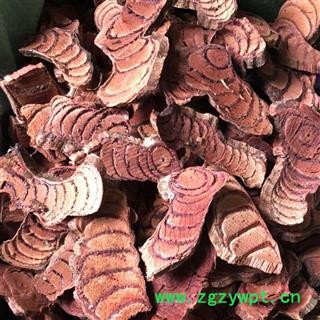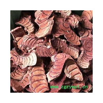 【药材性状】本品为椭圆形、长矩圆形或不规则的斜切片,厚0.3-1cm。栓皮灰棕色,有的可见灰白色斑栓皮脱落处显红棕色。质坚硬。切面木部韧皮部有树脂状分泌物呈红棕或黑棕色,与木部相间排列呈数个同心性椭圆形或偏心性半圆形环;髓部偏向一侧。
