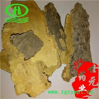 【性 状】外表面灰黄色或黄褐色,粗糙,有多数纵向皮孔样突起和不规则纵、横裂纹,除去粗皮者显黄白色。内表面淡黄色,较平坦