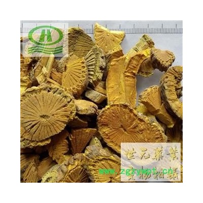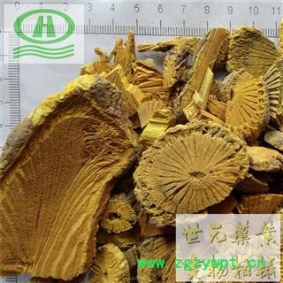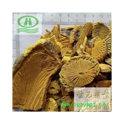 【药材性状】黄色圆片状,断面自中心点向外有辐射状纹路,纹路末端为表皮,质地疏松易碎