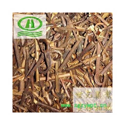 【性 状】茎枝呈圆柱形或类方柱形,长2~3cm,直径O.2~O.5cm。表面红棕色至紫红色者具细纵纹,光滑无毛;黄绿色至灰褐色者有的可见白色点状皮孔,被黄褐色柔毛。多数枝节上对生两个向下弯曲的钩(不育花序梗),或仅一侧有钩,另一侧为突起的疤痕;钩略扁或稍圆,先端细尖,基部较阔;钩基部的枝上可见叶柄脱落后的窝点状痕迹和环状的托叶痕。质坚韧,断面黄棕色,皮部纤维性,髓部黄白色或中空。气微,味淡