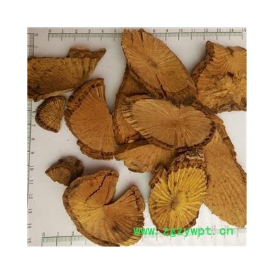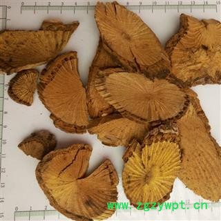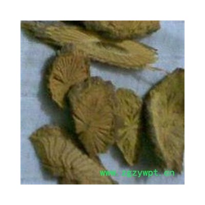 药材性状: 干燥茎呈圆柱形,梢弯曲,粗达3厘米以上。外表土灰色,节微隆起,具多数细纵沟和横裂。横切面木栓层较根部稍厚,约0.7~1毫米,暗棕色;皮层及韧皮部厚约2~3毫米,黄色,有空隙;本质部黄色至棕黄色,中心有小形髓部,辐射线色较暗。气味同根。以条大、色黄、断面有菊花纹、味苦者为佳。