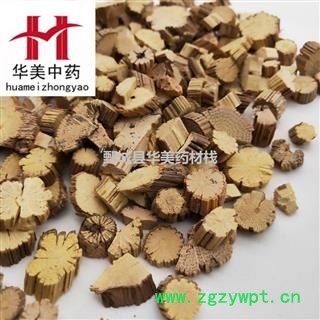【颜色性状】:淡黄色不规则的圆形薄片,皮部易与木部剥离,去皮处表面棕黄色,射线处有深棕色纵沟。质坚韧,难折断,断面木部黄白色,导管孔细密,排列不规则,有浅棕色射线。