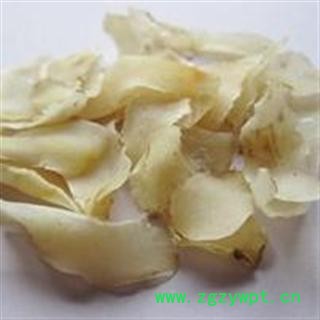 性状颜色:该品呈长椭圆形。表面类白色、淡棕黄色或微带紫色,有数条纵直平行的白色维管束。顶端稍尖,基部较宽,边缘薄,微波状,略向内弯曲。质硬而脆,断面较平坦,无臭,微苦。