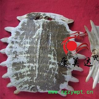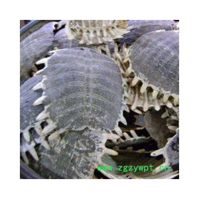 [性 状]:该品呈椭圆形或卵圆形,背面隆起,长10~15cm,宽9~14cm。外表面黑褐色或墨绿色,略有光泽,具细网状皱纹及灰黄色或灰白色斑点,中间有一条纵棱,两侧各有左右对称的横凹纹8 条,外皮脱落后,可见锯齿状嵌接缝。内表面类白色,中部有突起的脊椎骨,颈骨向内卷曲,两侧各有肋骨8 条,伸出边缘。质坚硬。气微腥,味淡。