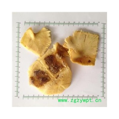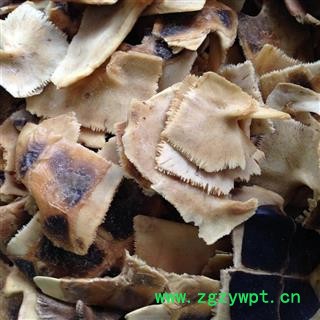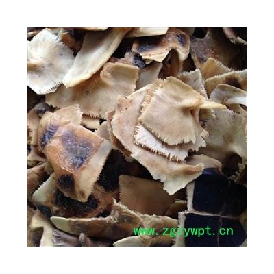 【颜色性状】:黄褐色的干燥外壳,不规则片状 体重质硬易碎