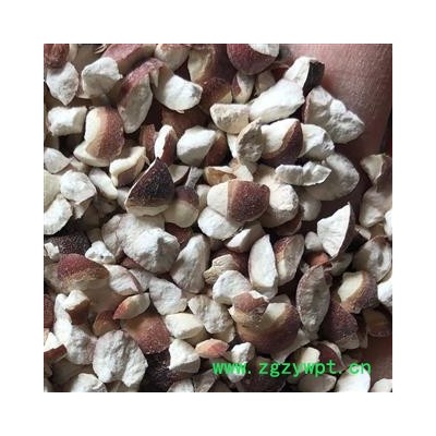 【性 状】:本品呈类球形,多为半球形破粒。表面有红棕色内种皮,一端黄白色。质较硬,破碎面白色,粉性。味淡。