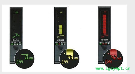 指示报警单元根据现场探头的信号以三色液晶的方式(柱状显示和数字显示)将浓度显示出来。根据危险程度将显示不同颜色的读数,例如:未超过报警点以绿色显示,超过一级报警点未超过二级报警点以橙色显示,超过二级报警点以红色显示。