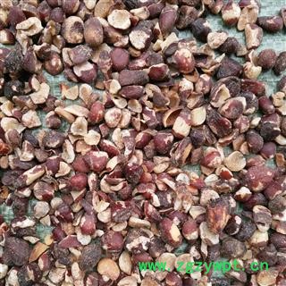 形状:种子略呈四面体,一面隆起,三面稍平坦;长1~2cm,宽0.5~1cm。表面灰黄白色至灰棕色,有多数隆起的纵脉纹,种脐位于种子的一端。种皮硬而脆,易碎。种仁不规则长卵形,外被暗紫褐色薄膜,具微细皱纹;胚乳黑棕色,子叶心脏形稍尖,色较浅。